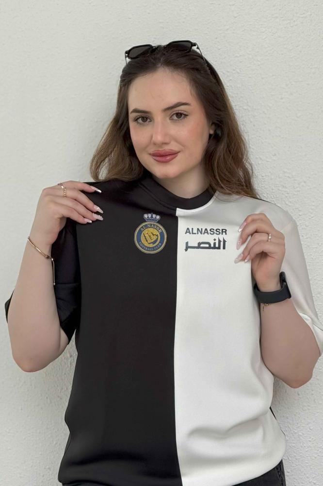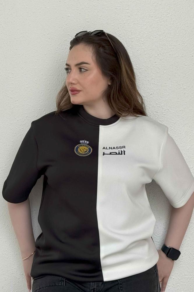 تميّز بإطلالة رياضية راقية مع تيشيرت نادي النصر بتصميمه الجريء الذي يجمع بين البساطة والأناقة. تم تصميم التيشيرت بنمط نصفين مميزين بالأبيض والأسود بشكل عمودي يرمز إلى التوازن بين القوة والأصالة