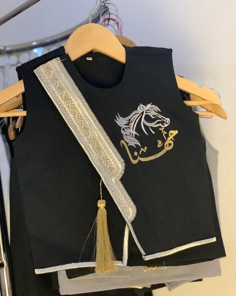 قمة الفخامة والشياكة بتطريز الاسم أو الحرف حسب طلبكم بزخرفة فنية ومتوفرة بمقاسات جاهزة تناسب الأجسام النحيفة والمتوسطة من سنة حتى 12 سنة