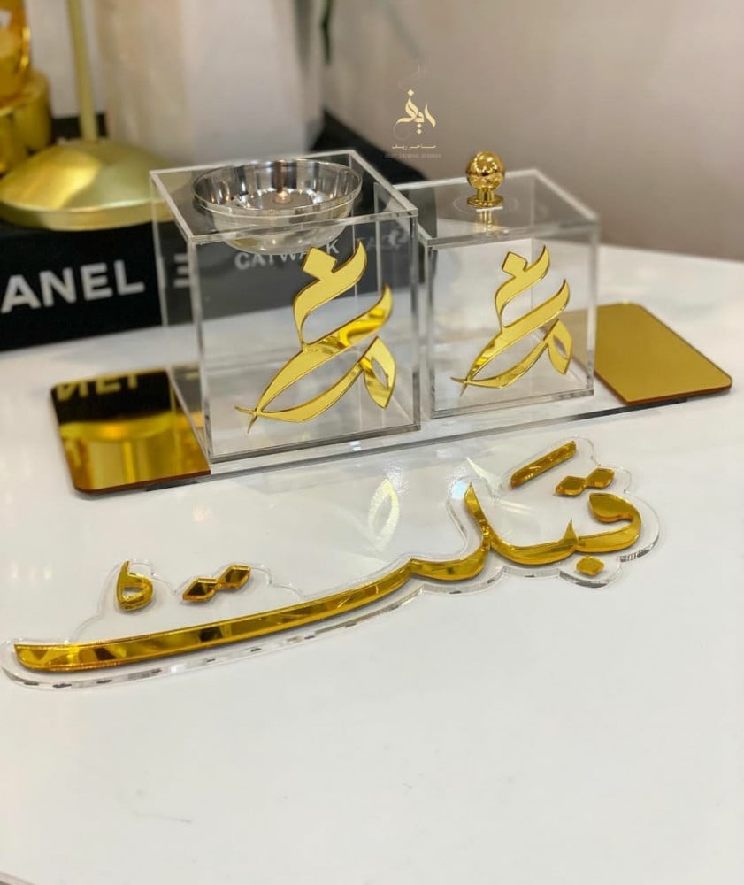 ريف قدمت لكم هذا الطقم المتميز ، والذي يتكون من صينيه ومبخره وحافظة بخور ، *(وكلمة قبلت )* ، يتميز بالمظهر الشفاف ، وتصميم الاحرف بطريقة جميله ، وبساطة المظهر ، ووزنه الخفيف ، وقوة التركيب ، .*ريف طريقكم للتميز*