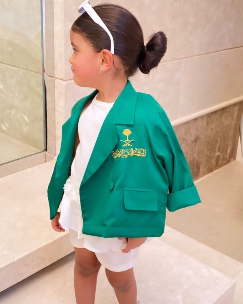 عرض مميز للاحتفال باليوم الوطني السعودي 93. جاكيت اليوم الوطني السعودي بتصمم مميز و بالهوية الوطنية .الرسمية بتصميم هوية اليوم الوطني السعودي 93 .مع إمكانية إضافة إسم في الخلف.واختيار نوع المنتج ولادي او بناتي .